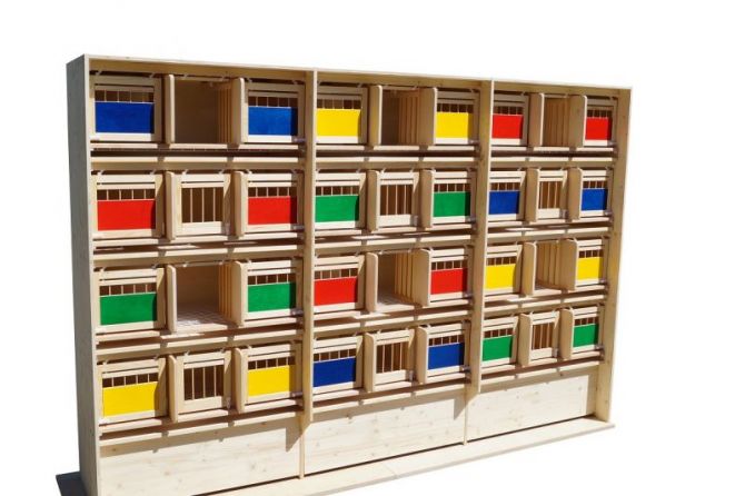 zwei Vögel und ein Weibchen gesetzt werden. Die Abteile sind jeweils durch ein Mittelgitter mit Durchlauf voneinander getrennt. Alle Gitter können einzeln geöffnet oder auch hochgeschwenkt werden.