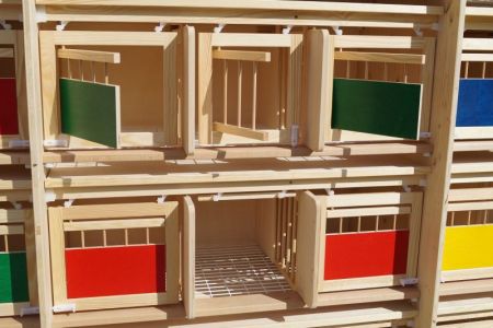 Die Motivationszelle mit drei Abteilen ist eine Erweiterung der Witwerzelle. Bei einer Zellenbreite von 94,2 cm sind hier drei Zellenabteile nebeneinander angeordnet. Somit können bei dieser Zelle zwei Weibchen und ein Vogel oder auch