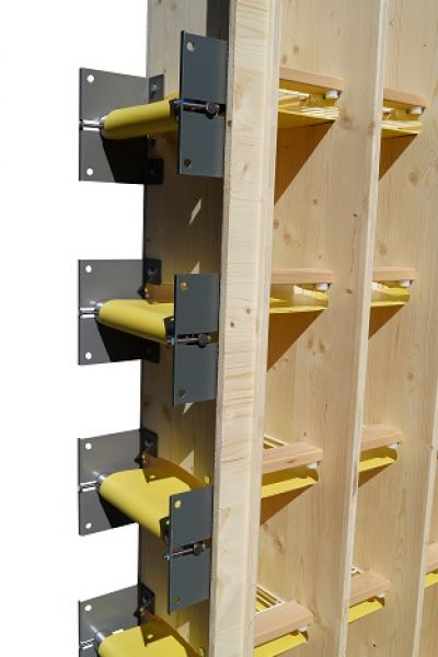 Die Drahtgitter sind so angeordnet, dass die Stäbe von vorne nach hinten verlaufen, dies verhindert, dass sich der Kot auf den Gittern festsetzt. Die Regale sind standardmäßig 5 Reihen übereinander gefertigt und unten mit einer aufklappbaren Sockelblende versehen.